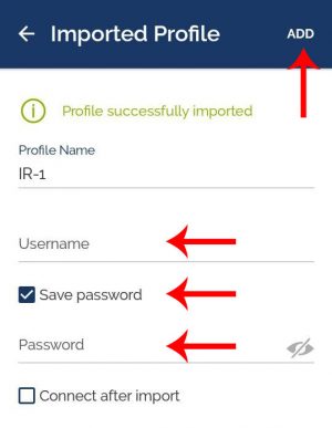 پس از اینکه فایل تنظیمات با موفقیت Import شد، گزینه Save password را تیک بزنید و Username و Password خود را وارد نمایید (به ایمیلتان ارسال شده است). سپس بر روی گزینه Add کلیک کنید (حال می توانید در صورت تمایل به مرحله دو برگردید و سرورهای دیگر را نیز اضافه کنید)